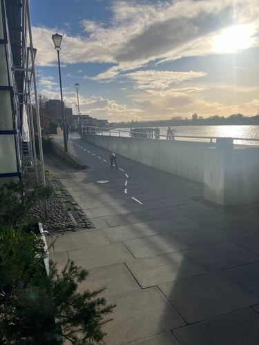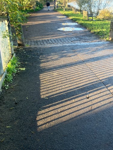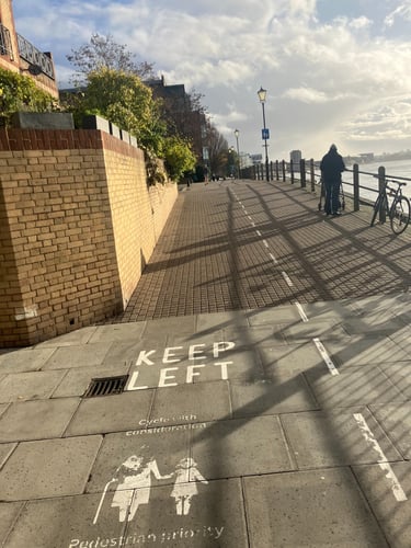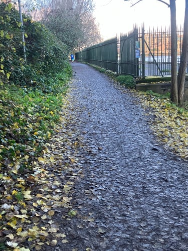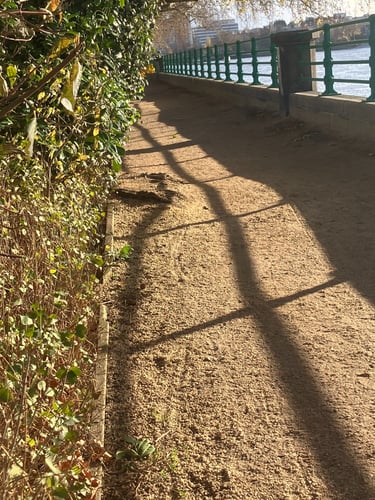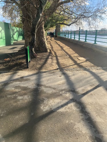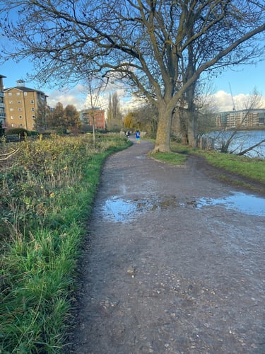 Surface - 4/5 difficulty - a mix of paving, tarmac or dirt track (hardened with crushed gravel). The north bank is has occasional uneven surfaces and steps but would is comparable to most London pavements. Depending on the time of year there can be puddles of standing water and wet leaves along the south bank that create trip hazards. Ankle boots recommended and would only be recommended for people confident walking on uneven surfaces.